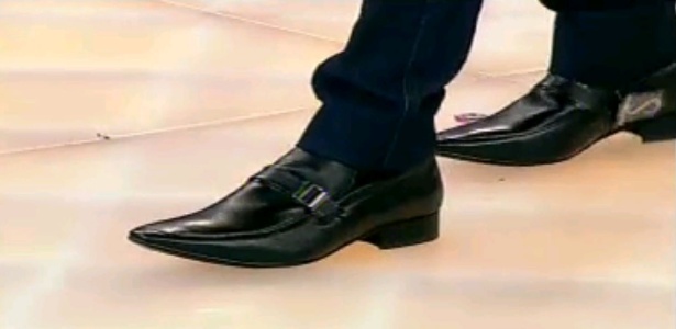 Geraldo Luís exibiu no início da tarde deste domingo (26) o par de sapatos que ganhou de presente de Silvio Santos. O dono do SBT mandou ainda um cartão, no qual elogia o apresentador da Record e lhe deseja votos de sucesso.