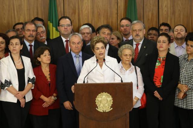 Ex-ministros da presidente, exonerados pela manhã, entraram primeiro. Militantes presentes gritavam "golpistas, fascistas, não passarão". Deputados e senadores do PT e de partidos da que ficaram contrários ao impeachment também aguardaram a chegada da presidente. De blazer branco, Dilma encarou o microfone e as câmeras.